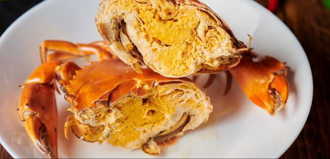 指膏蟹的卵沒有完全化油的蟹,有油底,同時具備膏蟹的膏,但比普通膏蟹更加順滑細膩,行內稱為二手黃油蟹,品質較高,吃起來軟糯甘香。
